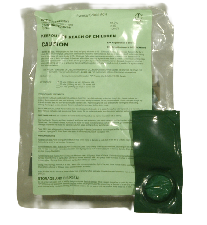 Synergy Shield MCH Bubble Caps, Douglas-fir Beetle Repellent uses MCH – a naturally occurring anti-aggregation pheromone of the Douglas-fir beetle to protect trees from attack by Spruce, and Douglas-fir beetles.