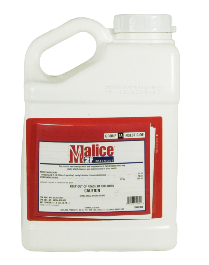 Malice 2F Insecticide generic for Merit 2F is a liquid concentrate containing imidacloprid for the control of insect pests in nearly all residential and commercial settings. Malice 2F is a neonicotinoid insecticide with long-lasting, residual control with proven performance on key pests such as white grubs, weevils and cutworms in turf plus aphids, mealybugs, leafminers and thrips in ornamentals.